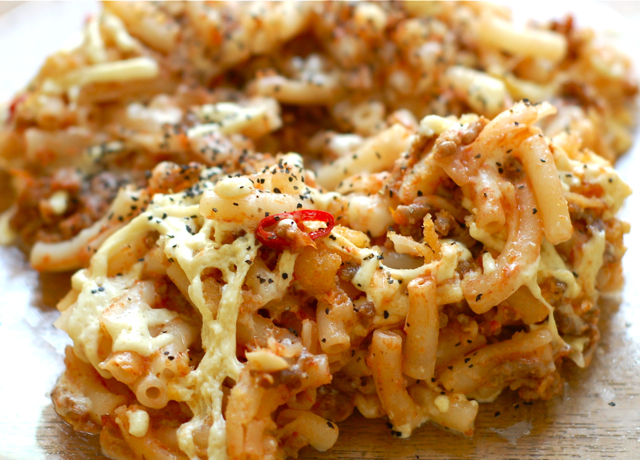 4 cups or so of cooked Kraft Dinner macaroni noodles, substitute with good pasta if you want.