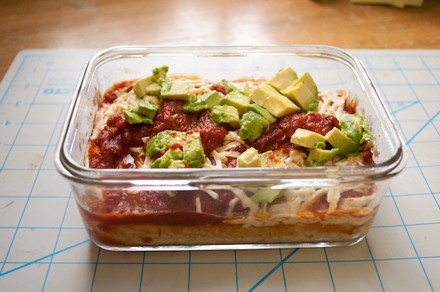 - At work, heat this up in a microwave until hot. Cut up the avocado and place on top (Avocados get brown really easily, which is why I prefer to take them to work whole.)