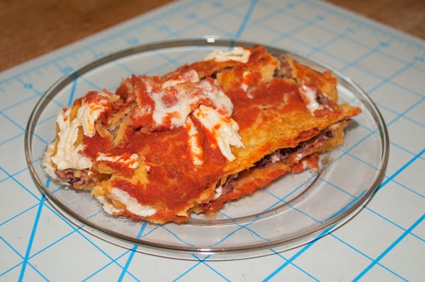This lunch is a hot mess when it’s cooked. It’s also a meal unto itself, so I just stuck it in a lunch container and heated it up at work. Also, the husband can eat real cheese and prefers flour tortillas to corn, so I made a separate dish for him.