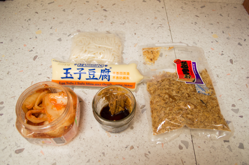 - Put the udon and egg tofu into a large bowl and cover with hot water. Microwave for about 3 minutes, until the noodles are the softness that you like them at.