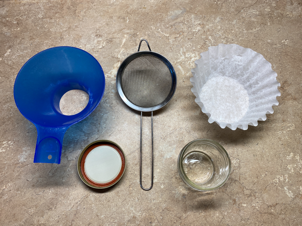 6. Pour the grease into the strainer which will take out any big chunks. The coffee filter will take out any sediment that somehow made it through the above processes.